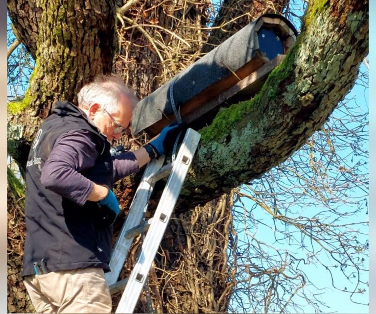Bei der jährlichen Überprüfung der Nisthilfen durch Herbert König stellte er fest, dass einer der 15 Steinkauzröhren an der Kleintierklinik nicht mehr sicher befestigt war. Der Ast, auf dem der Steinkauzkasten in 4 m Höhe angebracht war, drohte abzubrechen. Herbert König und Roland Büchel beseitigten die Gefahr und sorgten dafür, dass der Steinkauz wieder ein sicheres und einladendes Heim vorfinden kann.